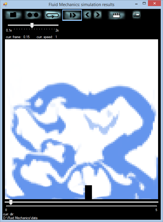 The initial geometry of fluid can be drawn by the user just like in a common graphics editor, using an adjustable brush. It is possible to save the geometry and to load it later in order to conduct simulations with other fluid properties, e.g. density or viscosity.