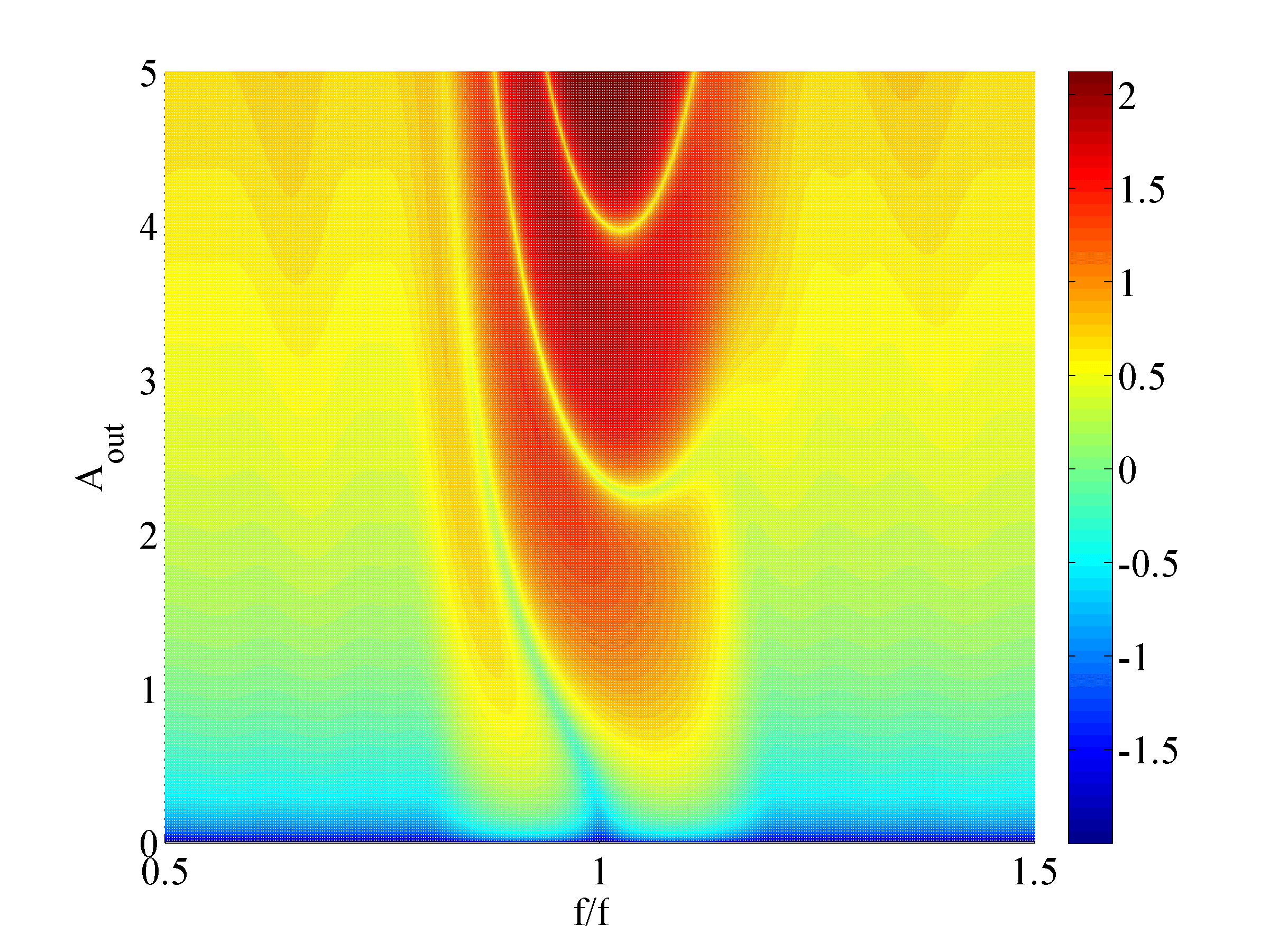 Logarithm of magnitude of wave transmitted through Bragg resonator with parallel nonlinear reactive lumped element for different incident magnitude (number on counters). Linear part of permittivity is equal to 1. Nonlinearity coefficient is equal to 0.05.