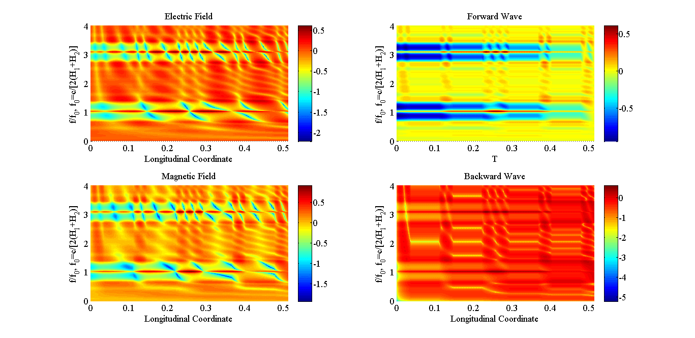 Electric and magnetic fields distributions versus normalized frequency and longitudinal coordinate along Bragg structure in logarithm scale