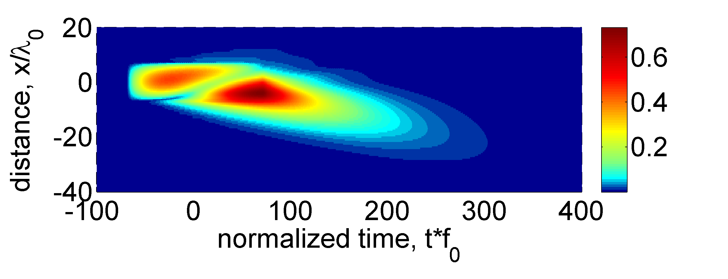 The reflection of the wave packet from Bragg resonators: (a) is the envelope of incident wave packet; (b) is the wave packet envelope reflected by an asymmetric Bragg resonator with far location of the resonance layer; (c) is the wave packet envelope reflected by an asymmetric Bragg resonator with near location of the resonance layer; (d) is the wave packet envelope reflected by symmetric Bragg resonator.